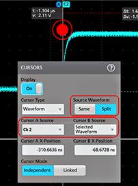 - To split the cursors between two waveforms, tap the Source field and select Split and select the source for each cursor. The cursors are moved to the specified waveforms.