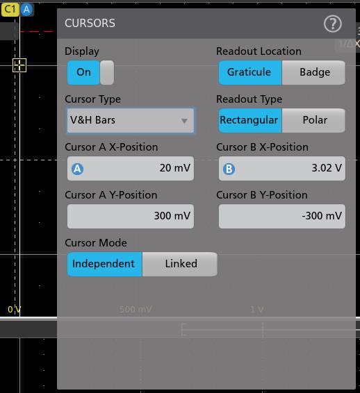 - To further configure cursors, double-tap on either cursor line or the cursor readouts to open the Cursors configuration menu. For example, tap the Cursor type to select the cursors to display, such as Waveform, V Bars, H Bars, and V&H Bars.
