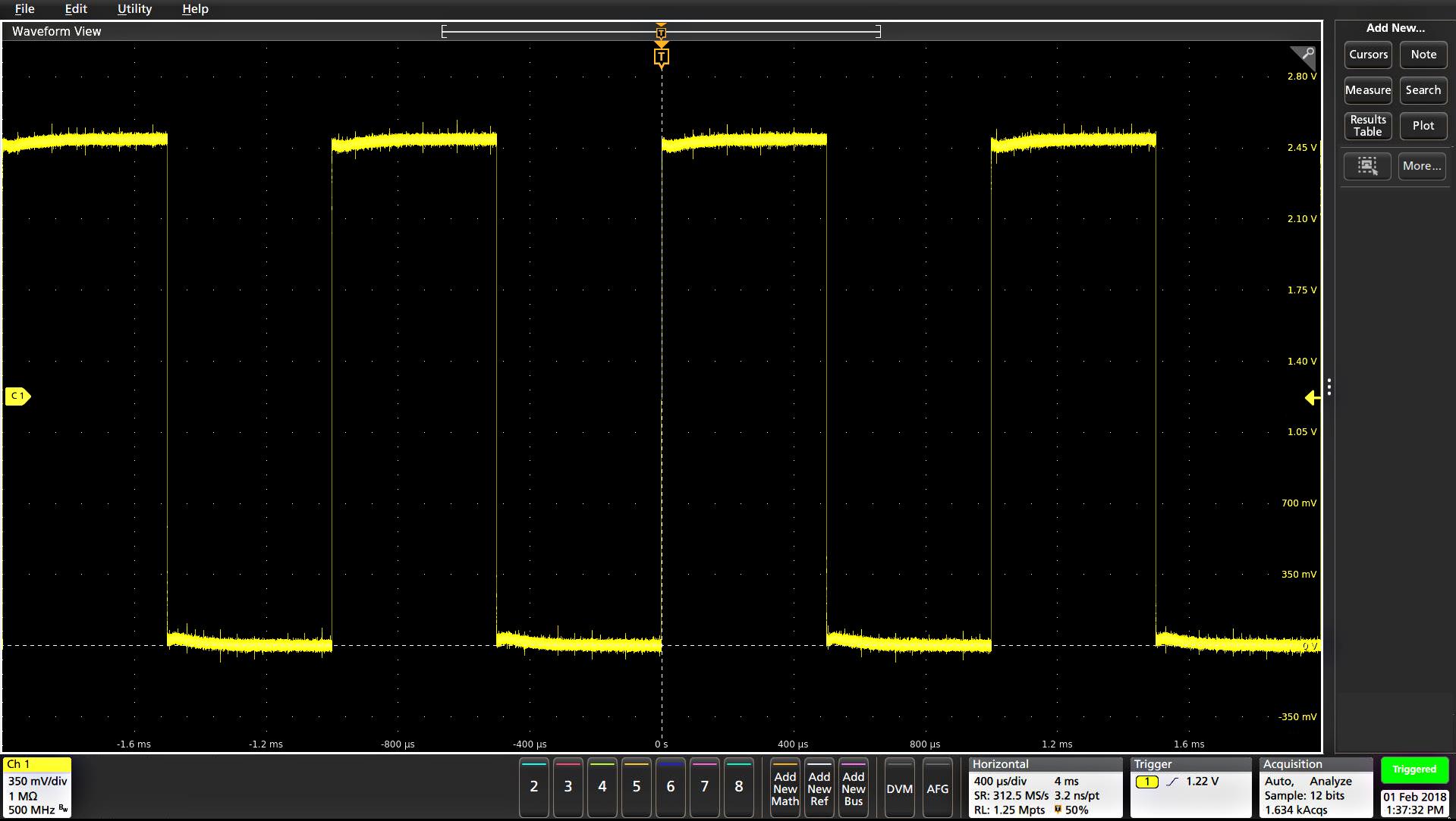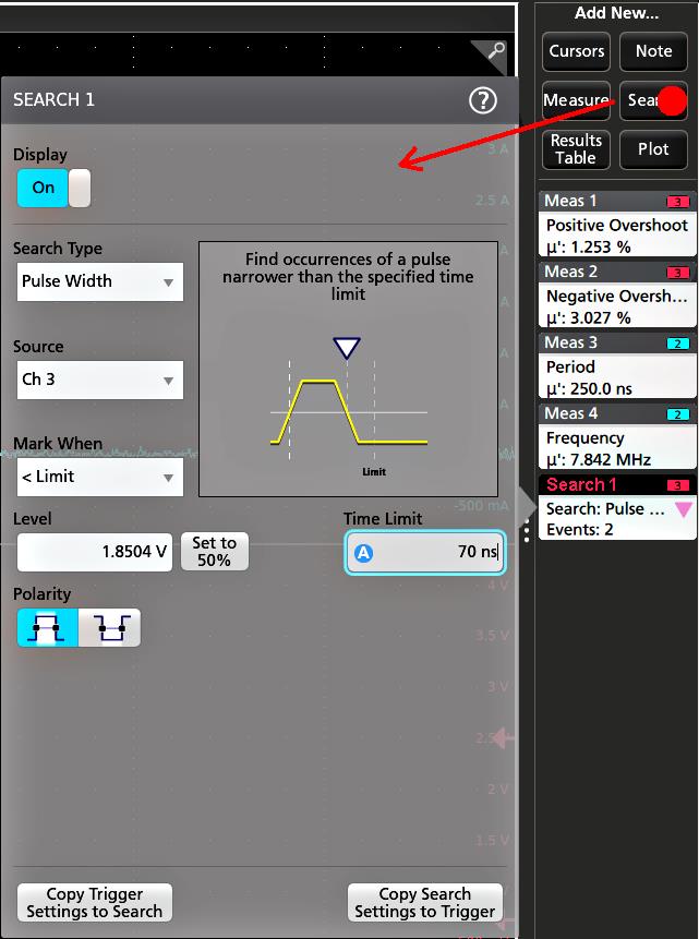 Prerequisite: Display the channel or waveform signal on which to search. The waveform must be displayed to create a search for it.