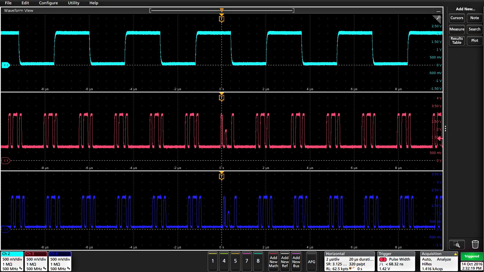 You can search on analog and digital signals, math waveforms, and reference waveforms. You can add searches to different waveforms and multiple searches to the same waveform.