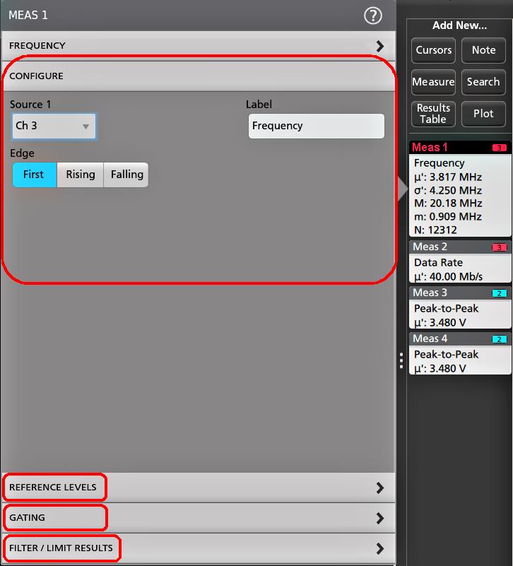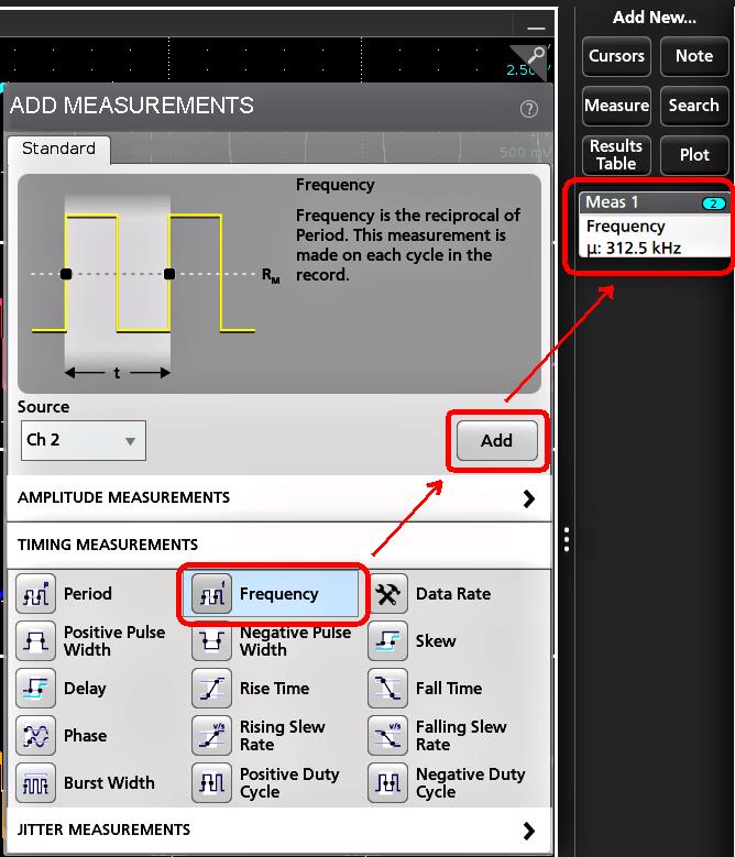 Note:Waveforms do not need to be displayed to be used for measurements, as long as the channel or waveform badge is on the Settings bar and is acquiring the signal to measure. - Tap the Add New...Measure button to open the Add Measurements configuration menu or drag the Measure button onto a waveform in the waveform display area to automatically set the source.