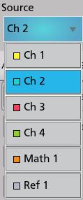 Note:If the menu shows tabs other than Standard, then optional measurement types have been installed on the instrument. Select a tab to show the measurements for that option. - Tap the Source field and select the measurement source. The list shows all available sources that are valid for the measurement.