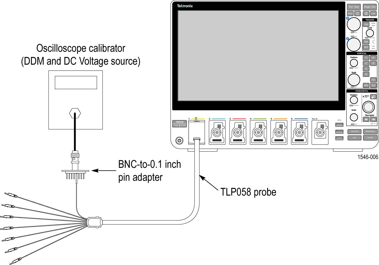 WARNING:Set the generator output to Off or 0 volts before connecting, disconnecting, or moving the test hookup during the performance of this procedure. The generator is capable of providing dangerous voltages.If you are using the Fluke 9500 calibrator as the DC voltage source, connect the calibrator head to the digital channel D0, using the BNC-to-0.1 inch pin adapter listed in the Required equipment table. Be sure to connect channel D0 to both the corresponding signal pin and to a ground pin on the adapter.