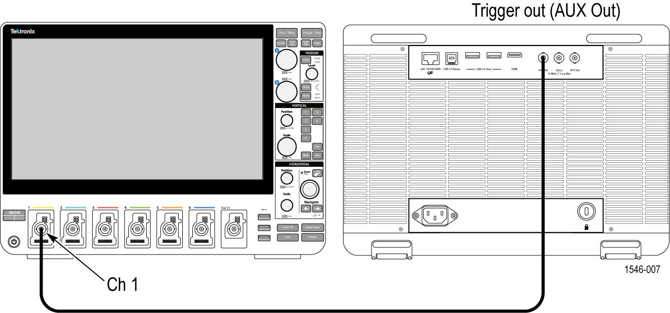 - Use a 50 Ω cable to connect the AUX Out signal from the rear of the instrument to the channel 1 input of the same instrument, as shown in the following illustration.