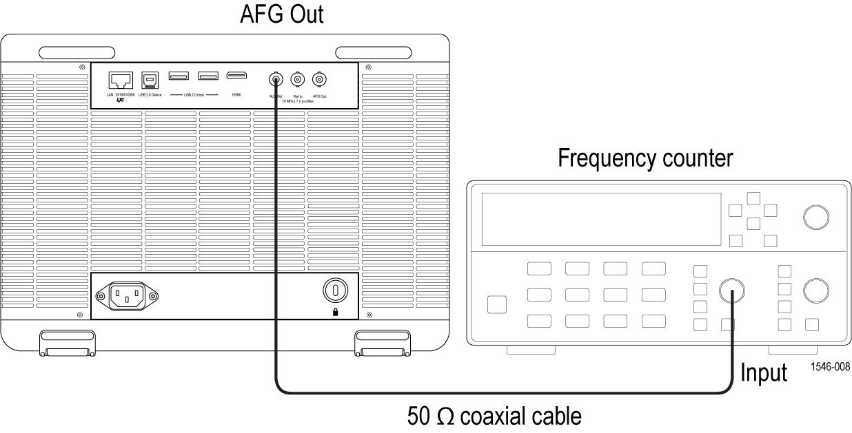 - Connect a 50 Ω cable from the AFG Out connector to the frequency counter input as shown in the following figure.