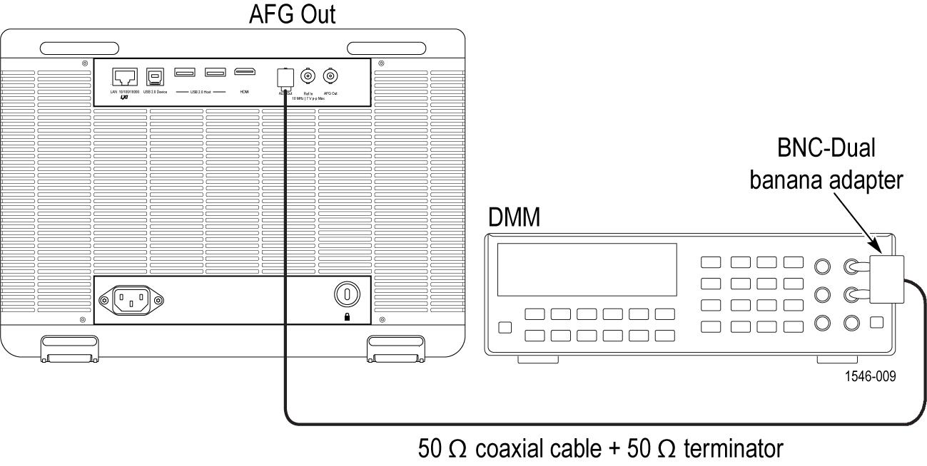 - Connect the arbitrary function generator output to the DMM as shown in the following figure. Be sure to connect the 50 Ω terminator to the AFG Out connector.