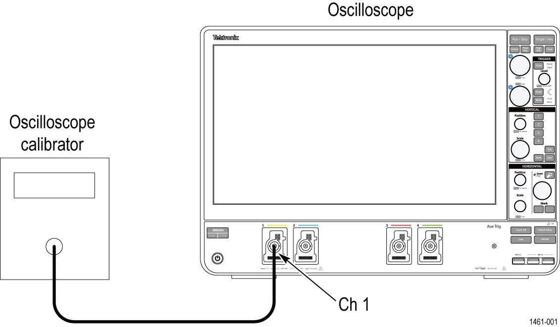 - Use a 50 Ω cable to connect the AUX Out signal from the rear of the instrument to the channel 1 input of the same instrument, as shown in the following illustration.