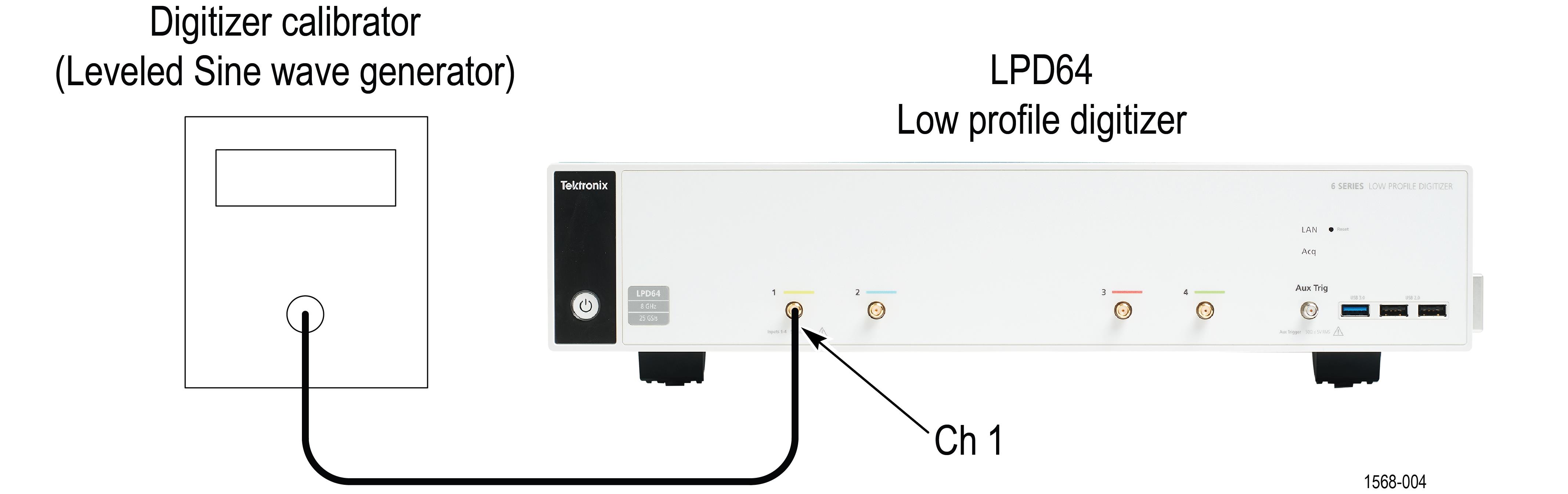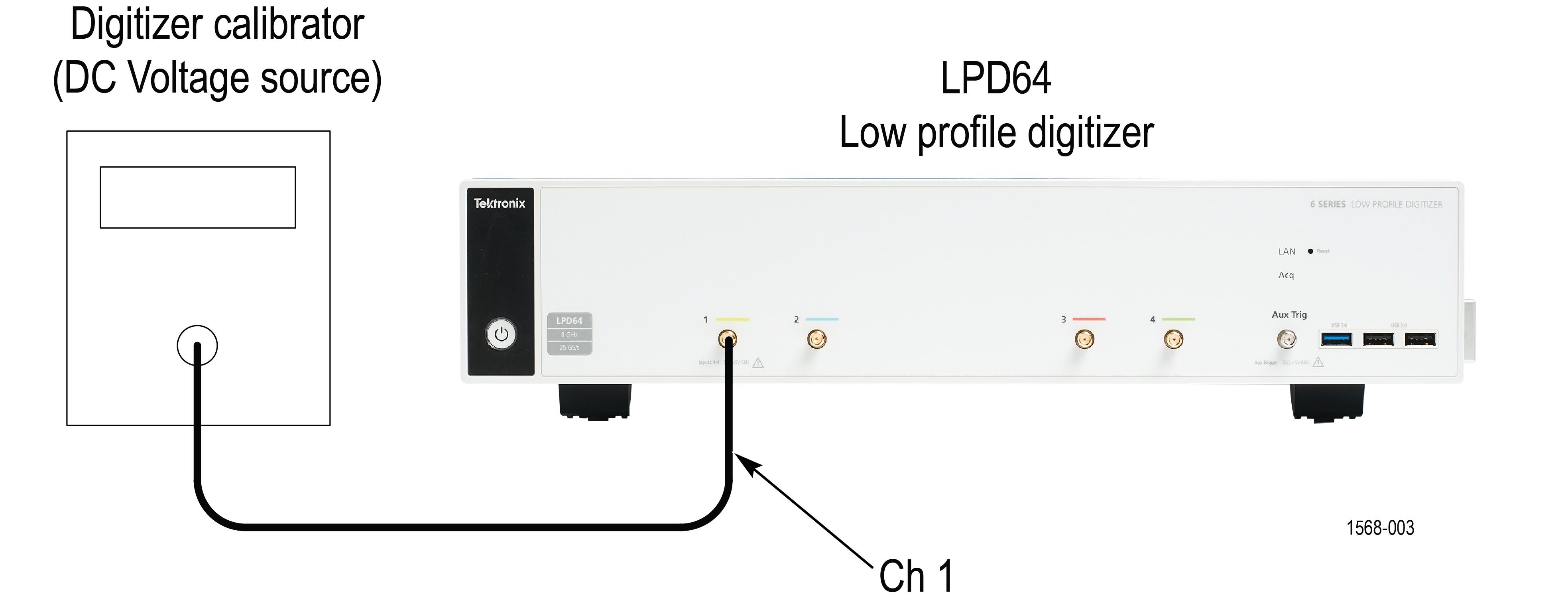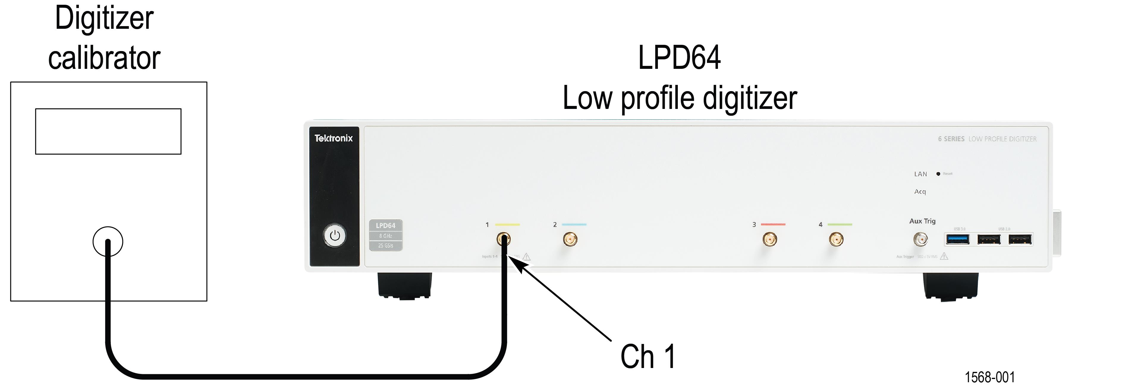 Use a 50 Ω cable to connect the AUX Out signal from the rear of the instrument to the channel 1 input of the same instrument, as shown in the following illustration.