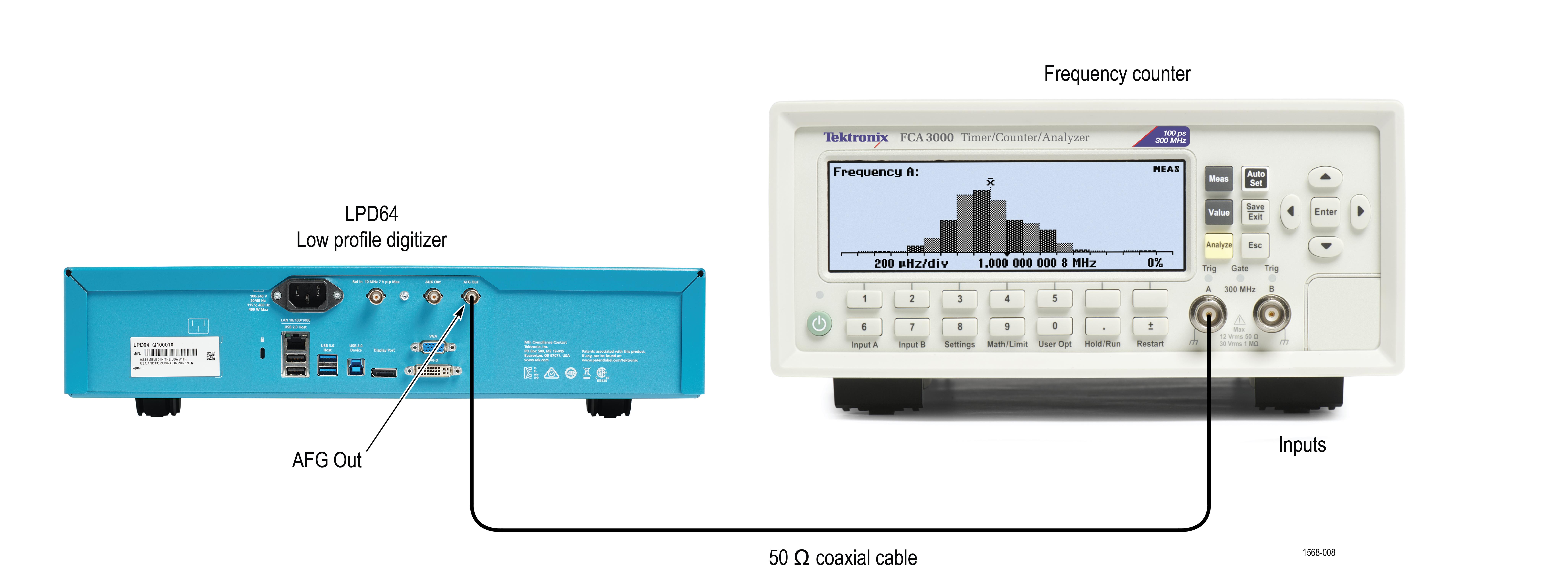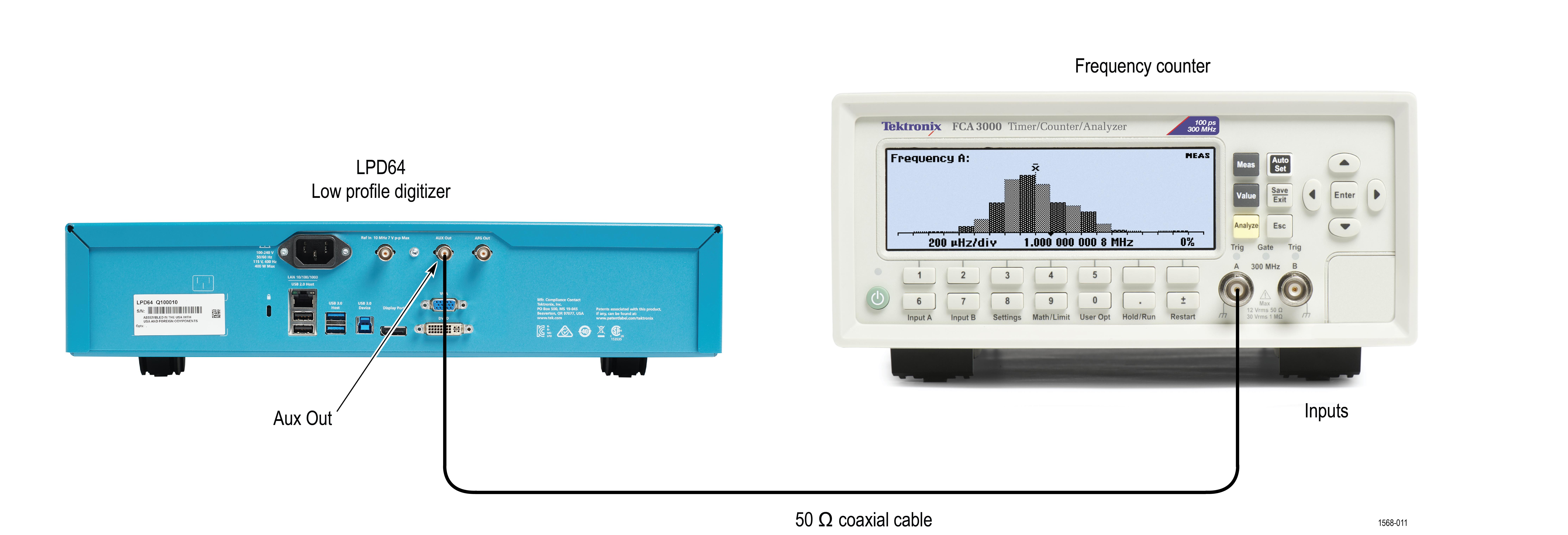 - Connect a 50 Ω cable from the Aux Out connector to the frequency counter input as shown in the following figure.