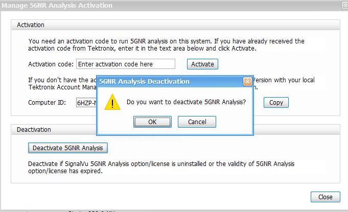 - If you receive the “5GNR Analysis activation failed. Please enter a valid activation code.” message, click OK, and then contact your local Tektronix support or Account Manager to get the correct activation code.