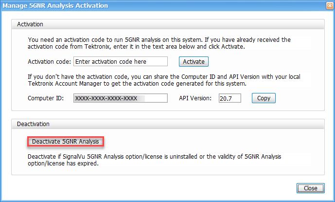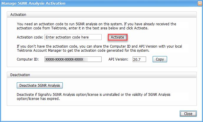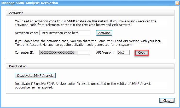 - If you do not have the activation code, under Activation, click Copy, and then close the Manage 5GNR Analysis Activation dialog box.