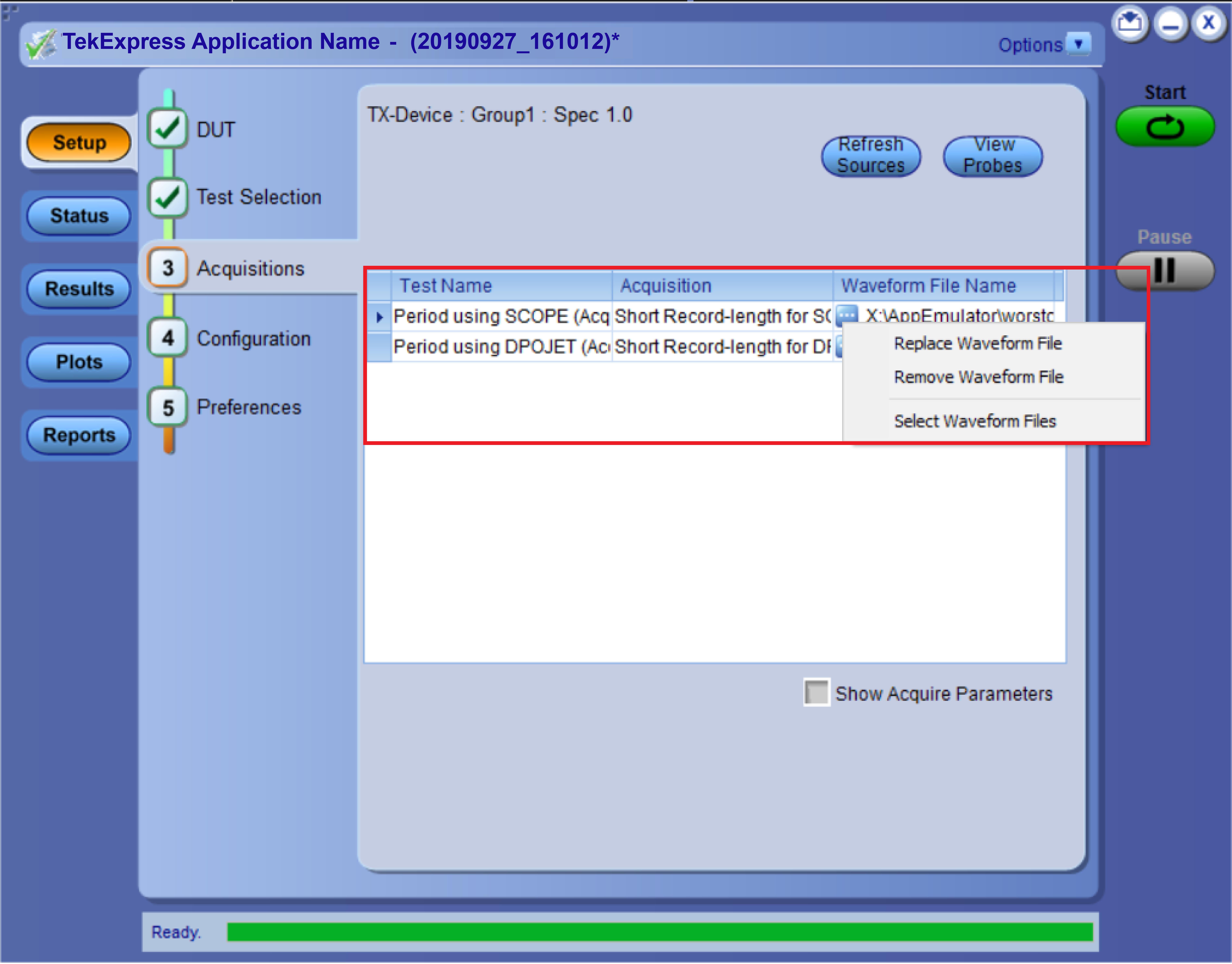- Set or query the waveform file recalled for the specified test name and acquire type