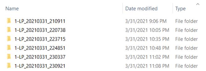 Inside the DUT001 folder are the session folders and files. Each session also has a folder and file pair, both named for the test session using the naming convention (date)_(time). Each session file is stored outside its matching session folder: