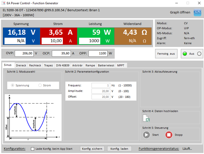 EA-Power Control is a software package for managing, controlling and programming of EA devices from a MS Windows© PC. The software puts EA devices directly on your computer screen and allows you to operate them, just as if you were operating them via the device HMI. EA Power Control offers some advanced applications for simulation or testing of different test objects.