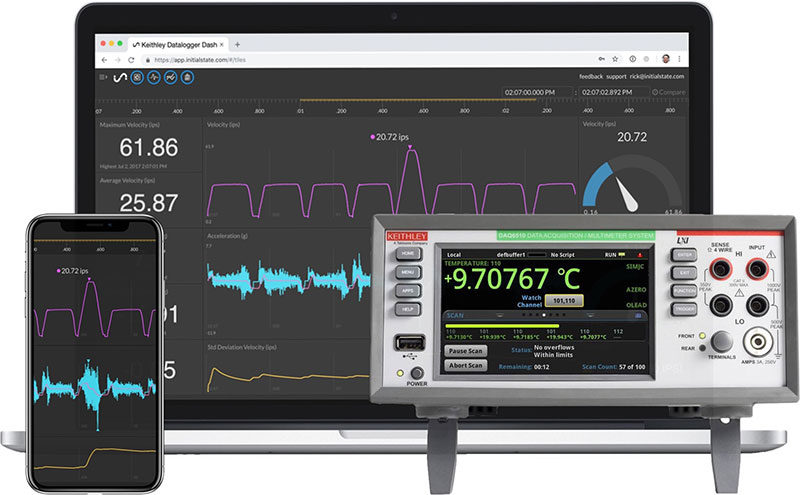 Stream data from your devices and services to beautiful interactive cloud-based data visualizations. Designed for monitoring, test, and data streaming applications, Initial State provides a scalable IoT streaming backbone with world-class anywhere-accessible data visualizations. Create real-time IoT dashboards using streaming data from any connected IoT device, PC, or via codeless integrations with instrumentation like the Keithley Datalogger/DAQ 6510.