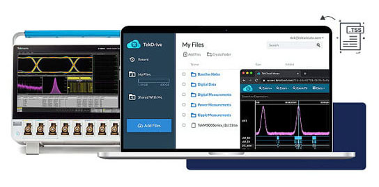 TekDrive is a collaborative test and measurement workspace wherein users can upload, store, organize, search, download, and share files from any connected device. Because TekDrive is natively integrated into many oscilloscope models, users can seamlessly and securely share files without a USB flash drive.